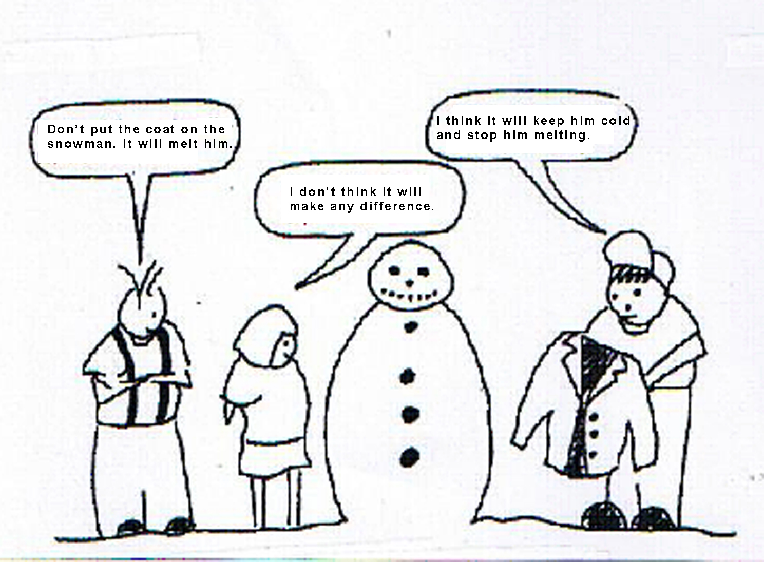 The concept cartoon above was developed to address the misconception that “some materials have the property of making things warm” (from https://www.conceptcartoons.com/). Each character in the cartoon conveys a particular idea “spoken” in the speech bubble.
