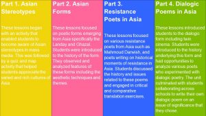 “The Asian poetry unit changed the way the students saw the world, not just Asia. It changed the way they approached poetry and Literature as a subject discipline. The poems allowed them to cross many borders: political, cultural, language, stereotypes, self. It was no different for me. The collaboration with NIE and other schools made concrete the hazy, nagging feeling that we could do better to represent the Literature of Asia, and it was the sharing of knowledge and resources and pedagogy that made it possible. It was a most invigorating and expansive exercise indeed!”
