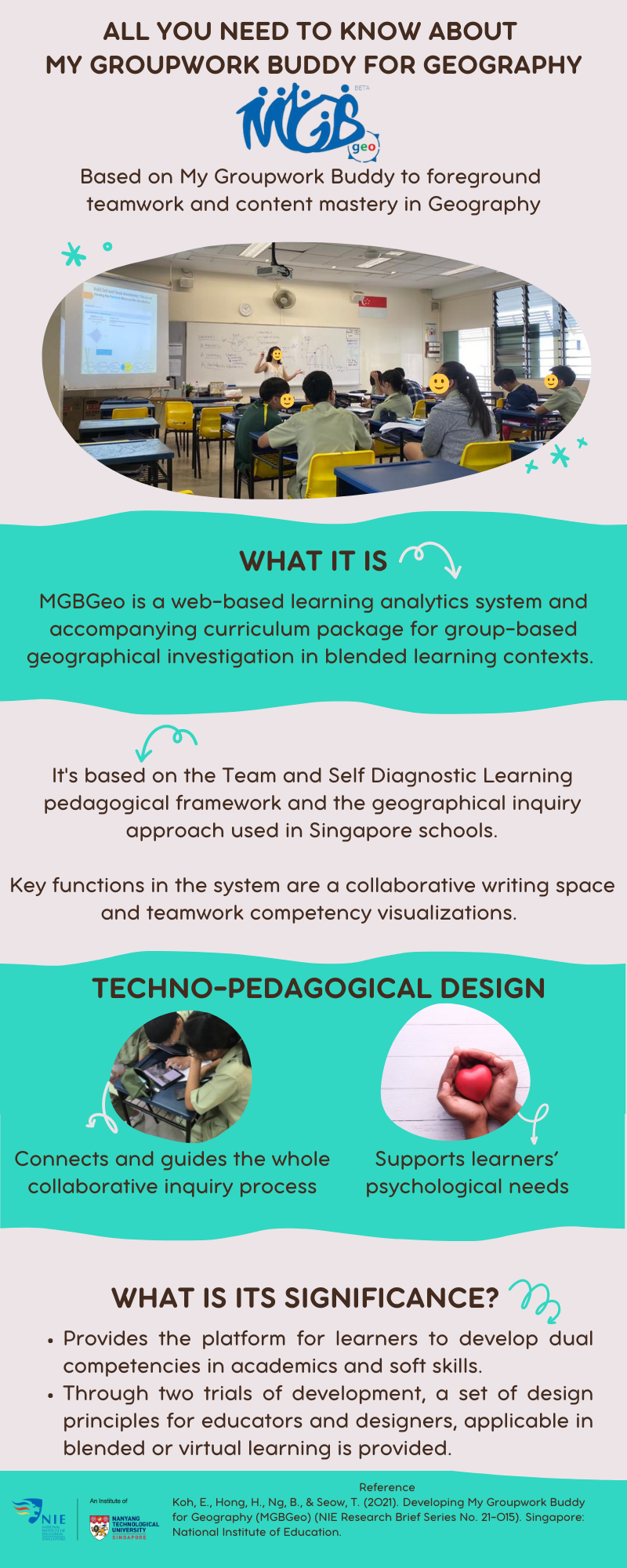 - Koh, E., Tee, Y-H., Suresh, D., Ng, B., Hong, H., &, Seow, T. (2020). Supporting Collaborative Inquiry for Geography and Teamwork Learning: The Techno-Pedagogical Design of My Groupwork Buddy for Geography. In So, H. J. et al. (Eds.). Proceedings of the 28th International Conference on Computers in Education (pp. 159-164). Taiwan: Asia-Pacific Society for Computers in Education.