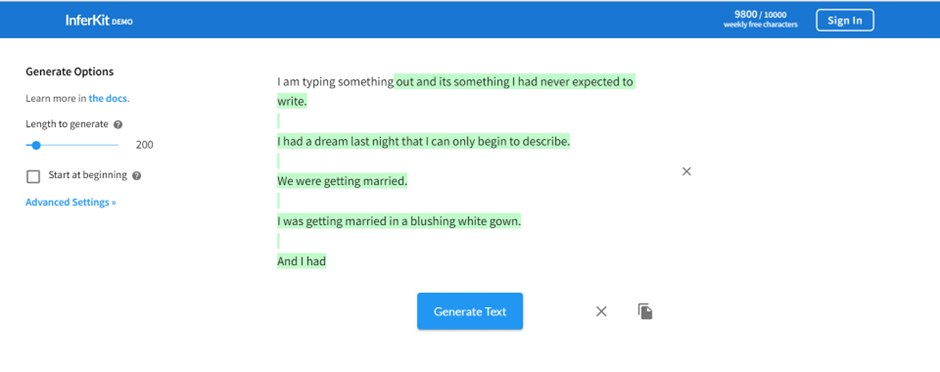 Figure 5. InferKit Demo uses a neural network to generate text and extend whatever one has previously written. The part in green is the text generated by the network