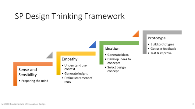 Students spend one semester of instructional time to learn the SP Design Thinking framework, which consists of four fluid and iterative stages: Sense & Sensibility, Empathy, Ideation and Prototype. Each stage has different objectives and intended outcomes as outlined in Figure 1.