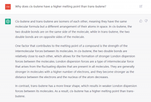 The first question raises two fundamental limitations of ChatGPT. First, ChatGPT delivers on well-posed close-ended questions, i.e., questions which are factual and premised on a factual assumption. However, when asked a question which is presupposed on erroneous facts, it can generate an incorrect response, even confidently. In the following example in Figure 4, ChatGPT confidently answered the question even though the question was incorrect (i.e., cis-butene has a lower melting point than trans-butene whereas ChatGPT supplied an explanation to the contrary). If students are over-reliant on using ChatGPT as a search engine and do not verify their answers, they run into the possibility of learning the wrong facts, or worse still, inculcating misconceptions which may be very difficult to unlearn.
