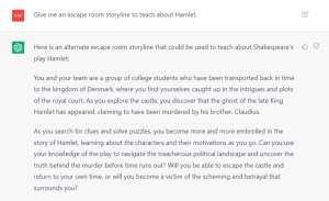 Figure 5. ChatGPT’s response when asked to design an escape room activity for Hamlet.