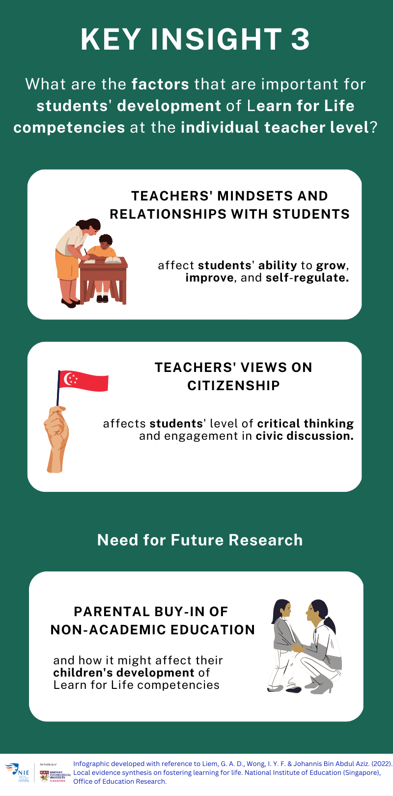 - Teachers’ mindsets, relationships with students, and views on citizenship are all important for development of Learn for Life competencies.