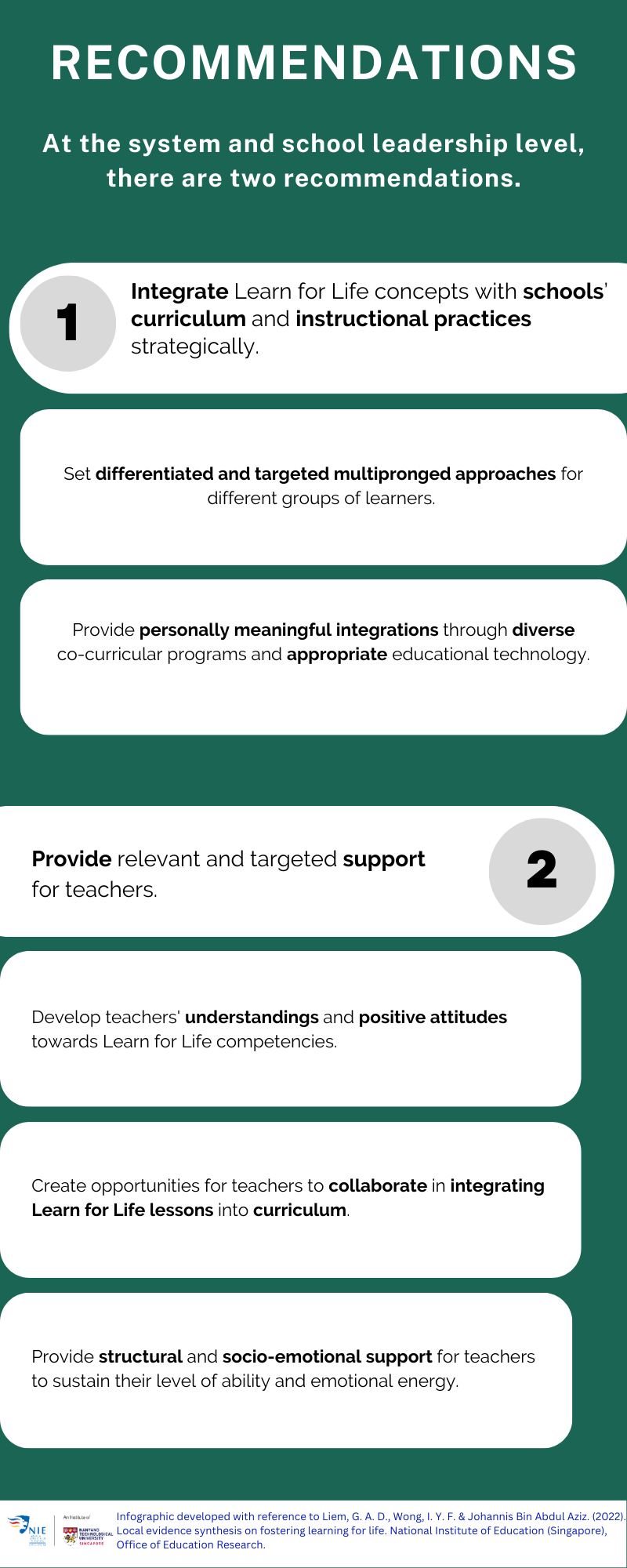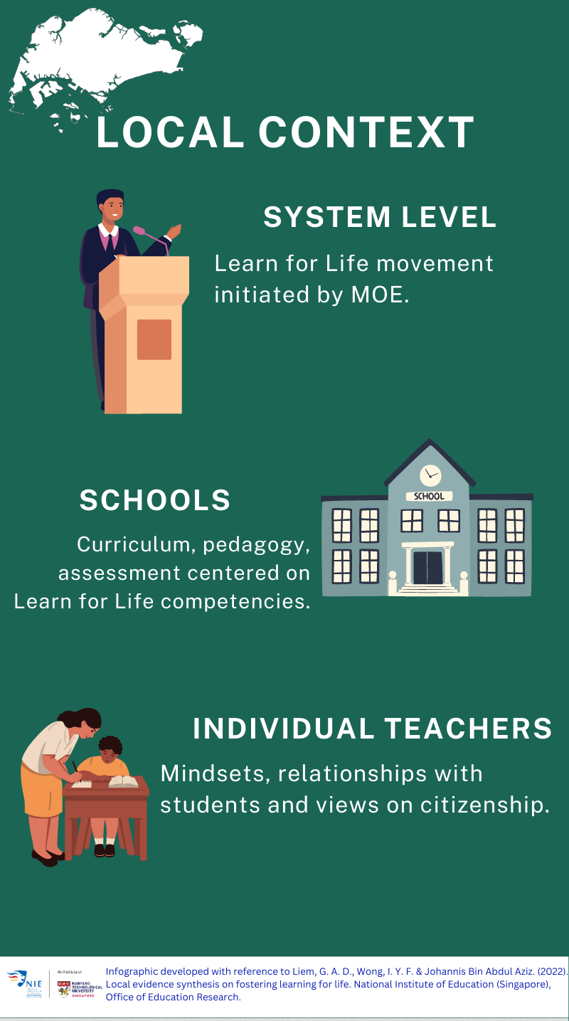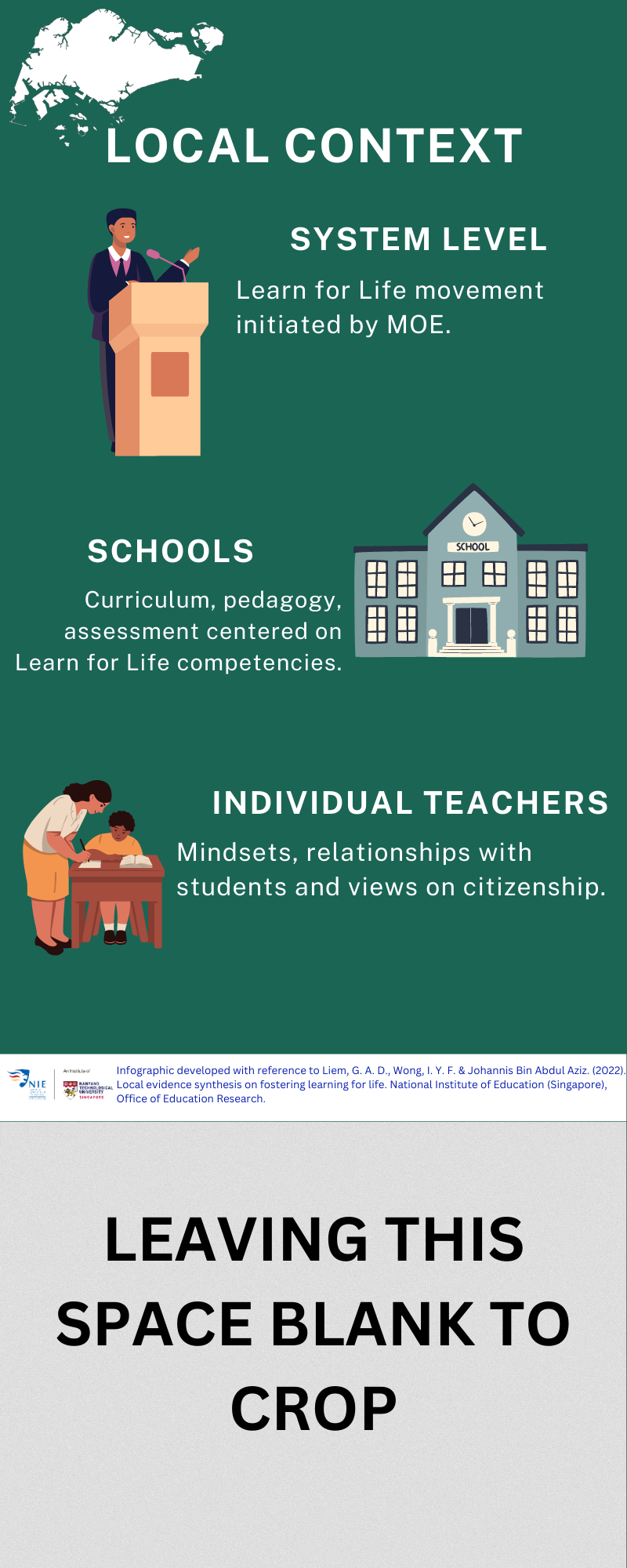 The LES on Fostering Learning for Life involves 32 studies funded by the Education Research Funding Programme (ERFP), National Institute of Education, Nanyang Technological University, Singapore and 2 studies funded by MOE Academic Fund (MAF) and administered by Office of Education research (OER). Any opinions, findings, and conclusions or recommendations expressed in this material are those of the author(s) and do not necessarily reflect the views of the Singapore MOE and NIE.