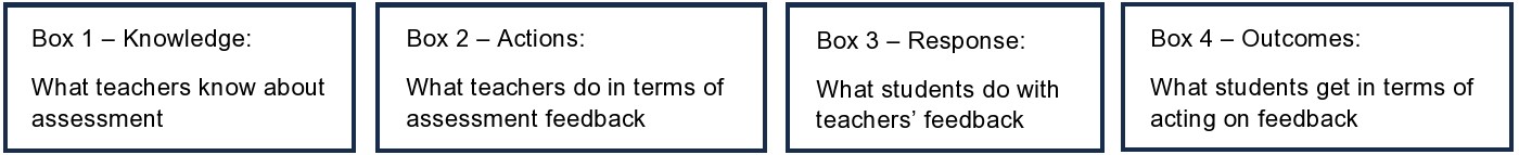 The connections between teachers’ assessment literacy and students’ learning outcomes can be represented as a sequence of questions for teachers, as shown in Figure 1. The four boxes represent a chronology, starting from teachers attending professional development courses on assessment feedback (Box 1, Knowledge), then applying feedback principles to their practice (Box 2, Actions), with students subsequently acting on teachers’ enhanced feedback (Box 3, Response), and finally with students achieving desired learning outcomes from acting on the feedback (Box 4, Outcomes). Boxes 3 and 4 in this model highlight how the efficacy of feedback rests with students’ action.