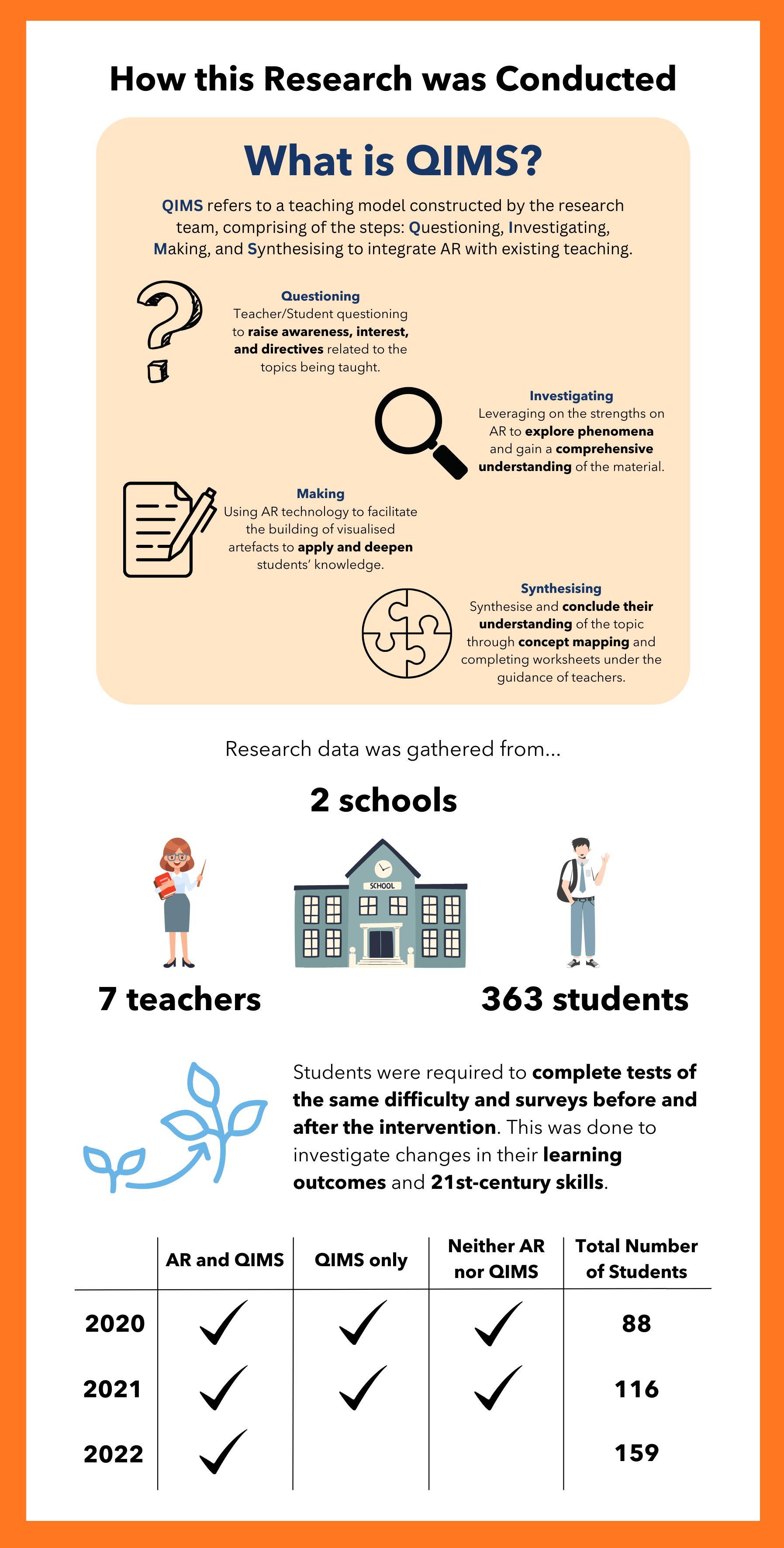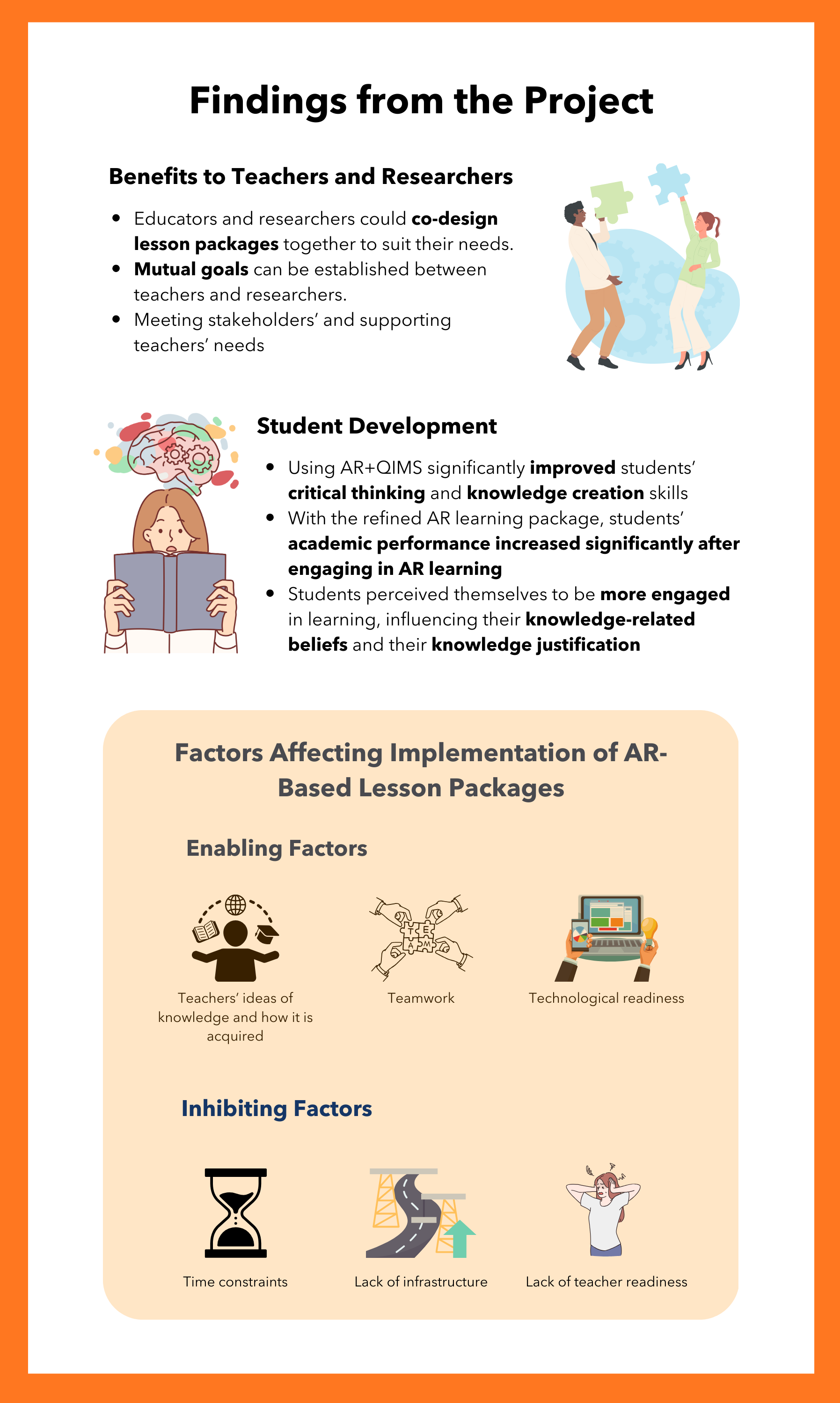 - Pairing the augmented (AR) system with the Questioning, Investigating, Making, Synthesising (QIMS) model notably enhanced students’ critical thinking and knowledge creation.
