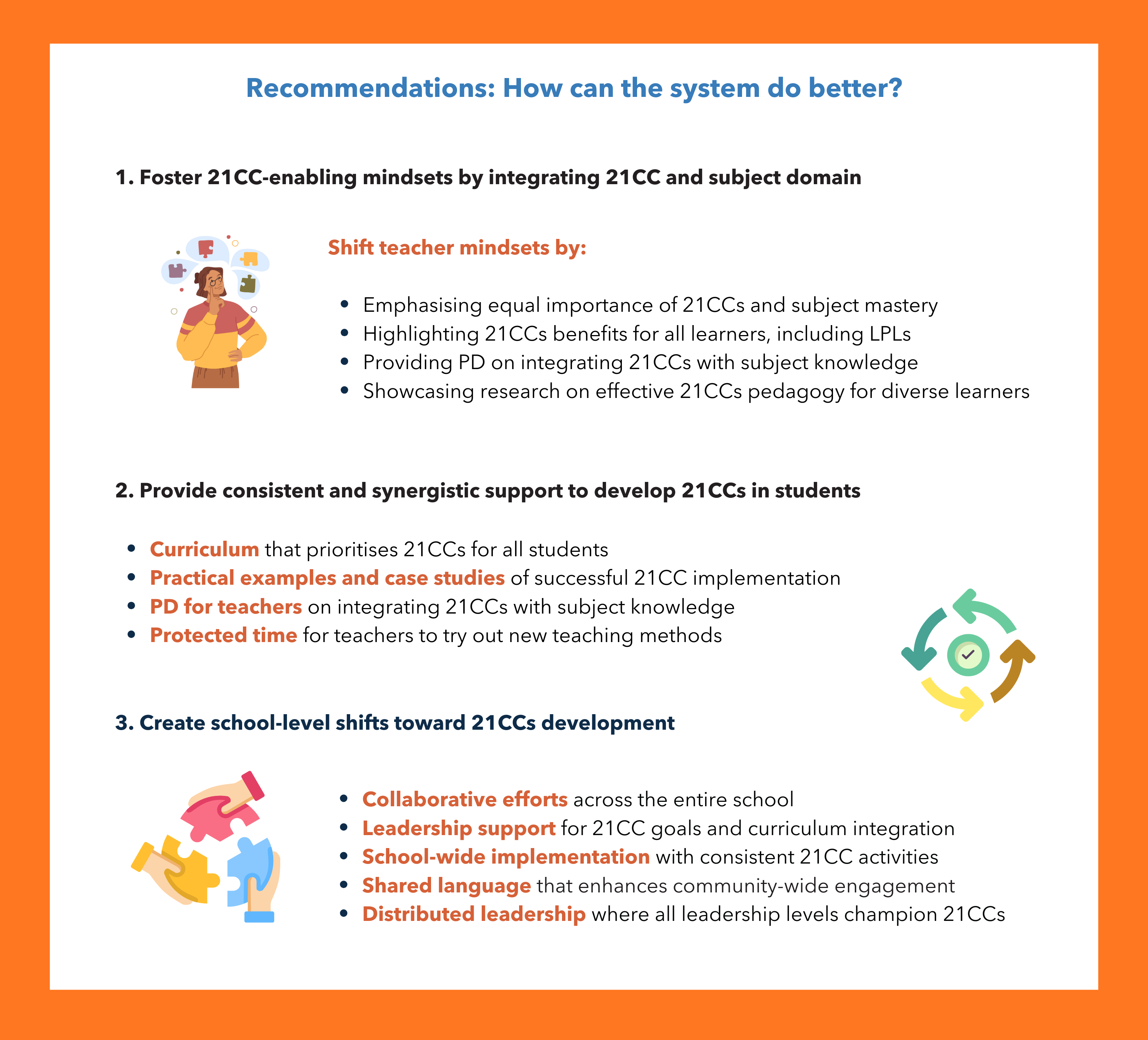 • The article concludes with recommendations for fostering 21CC development among students and teachers and identifies research gaps for future exploration, aiming to inform policy and practice.