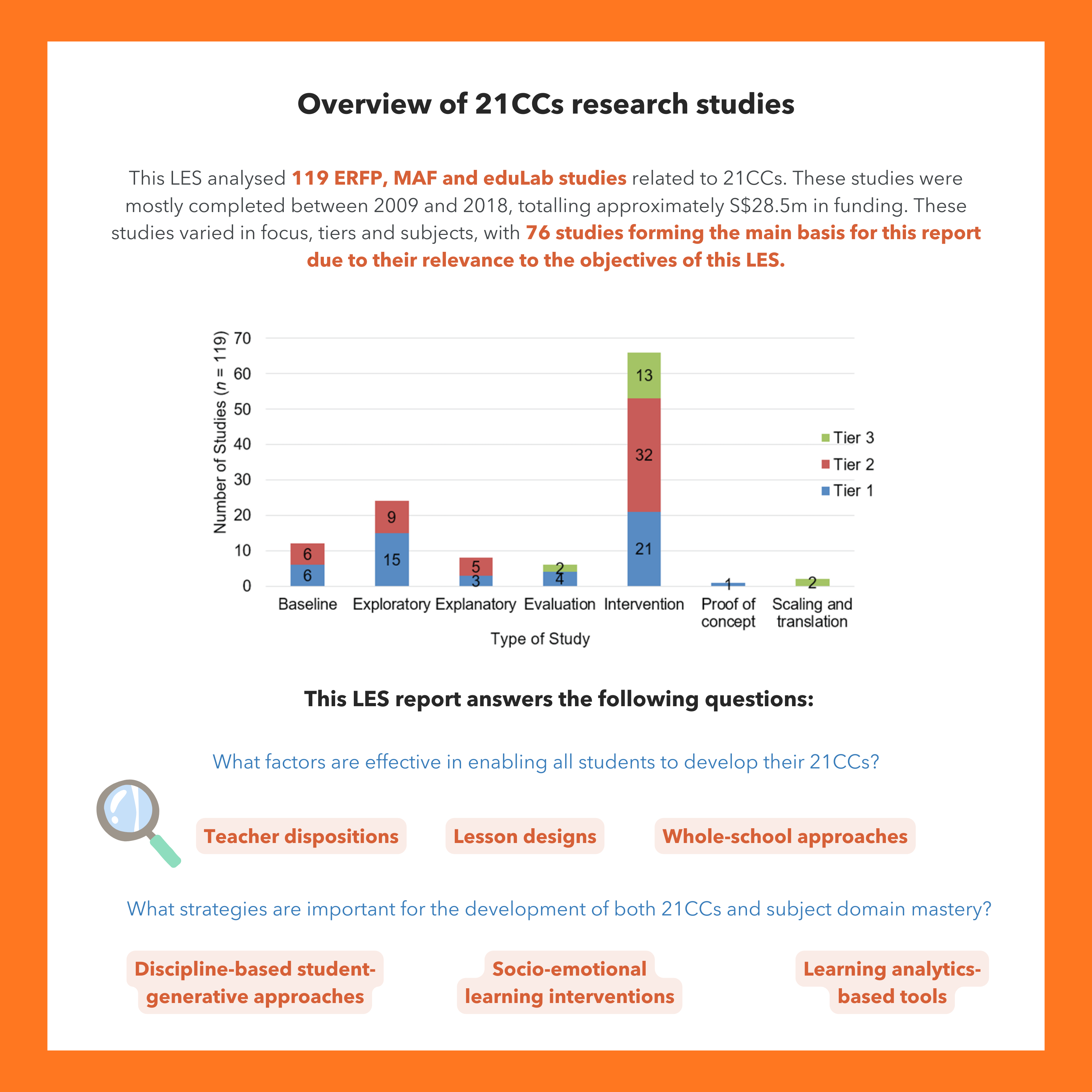 The LES on Teaching and Learning 21st Century Competencies involves 119 studies funded by the Education Research Funding Programme (ERFP), MOE Academic Fund (MAF) and eduLab and administered by the Office of Education Research (OER). Any opinions, findings, and conclusions or recommendations expressed in this material are those of the author(s) and do not necessarily reflect the views of the Singapore MOE and NIE.