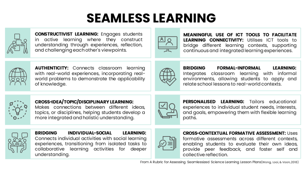 To support teachers in implementing Seamless Learning experiences, Wong, Looi, and Voon (2018) developed a useful framework in the form of a Seamless Learning lesson design rubric, comprising eight design principles derived from a synthesis of Seamless literature (see Figure 1).