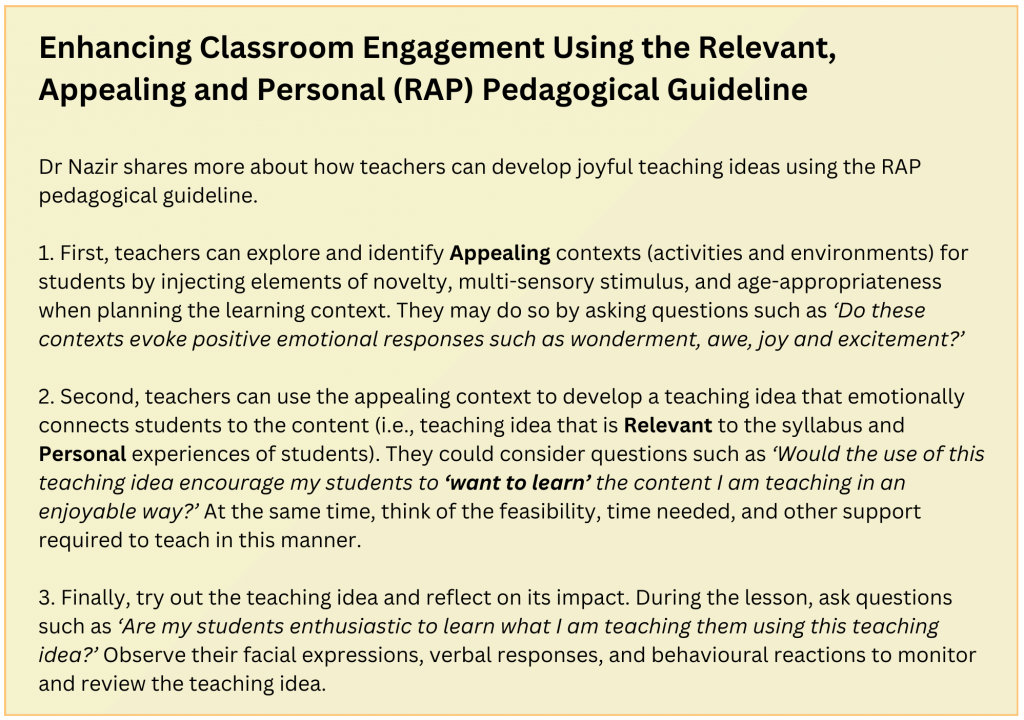 The examples shared by Nazir illustrate how joyful teaching ideas can come alive in the classroom by using the Relevant, Appealing and Personal (RAP) pedagogical guideline. Developed through his research, this guideline aims to foster intrinsic motivation and engagement in students’ learning in Singapore classrooms (Amir, 2022).