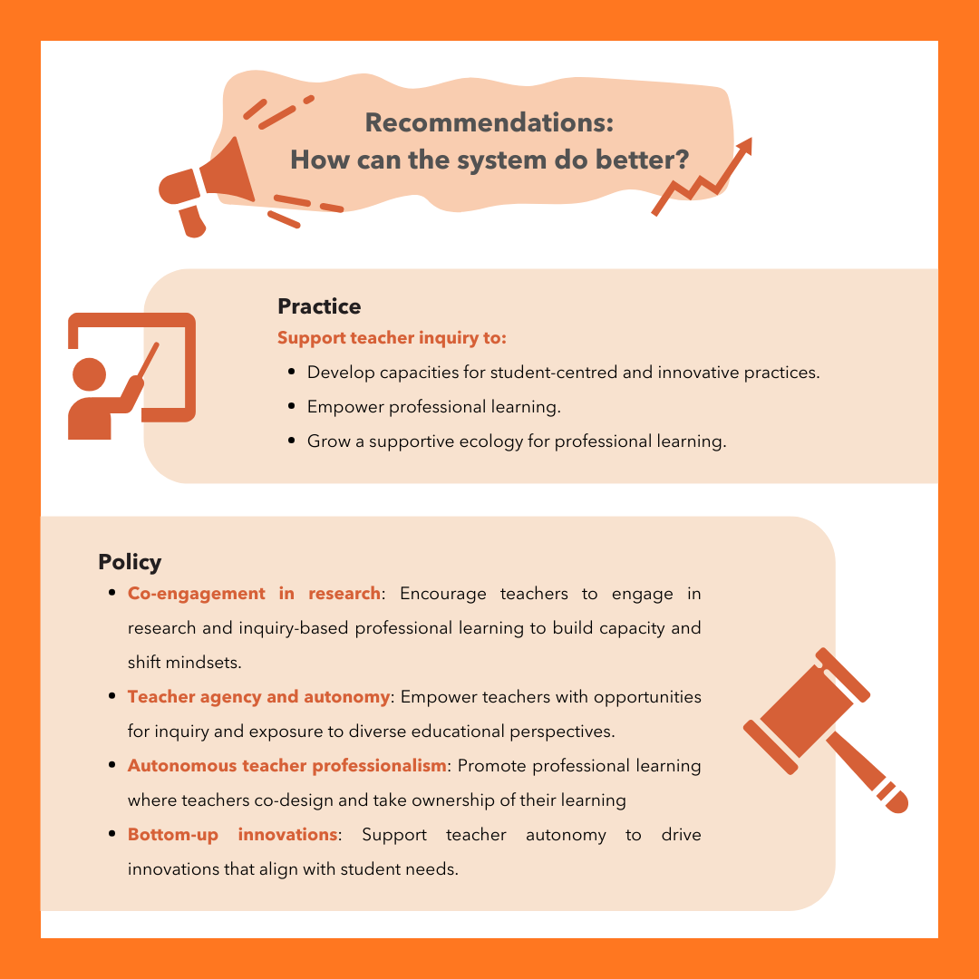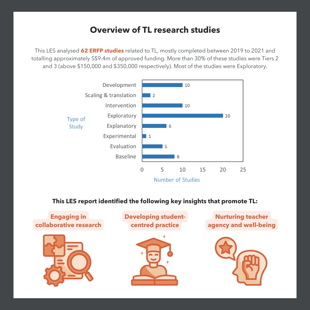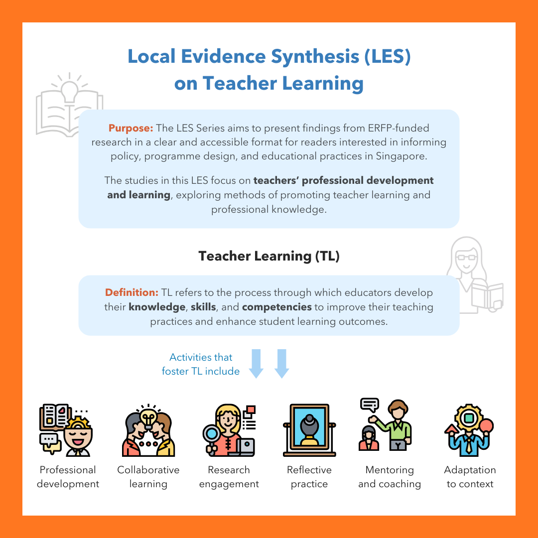 The LES on Teacher Learning involves 62 studies funded by the Education Research Funding Programme (ERFP) and administered by the Office for Research (OfR), formerly Office of Education Research (OER). Any opinions, findings, and conclusions or recommendations expressed in this material are those of the author(s) and do not necessarily reflect the views of the Singapore MOE and NIE.